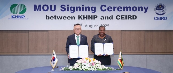 이미지 확대보기한국수력원자력이 짐바브웨 교육혁신연구개발센터(Center for Education Innovation Research and Development, CEIRD)와 업무협약을 체결하고, 짐바브웨에 혁신형 SMR(i-SMR) 도입을 위한 예비타당성조사 등에 협력하기로 했다.