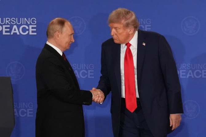 도널드 트럼프 미국 대통령과 블라디미르 푸틴 러시아 대통령이 지난 8월 15일(현지시간) 미국 알래스카 엘멘도프-리처드슨 합동기지에서 만나 환하게 웃으며 악수하고 있다. 두 정상은 러시아-우크라이나 전쟁 종식을 위한 고위급 회담을 위해 만났으며, 이날 미군 전투기들이 상공을 비행하며 군사력을 과시하기도 했다. 사진=AP/연합뉴스