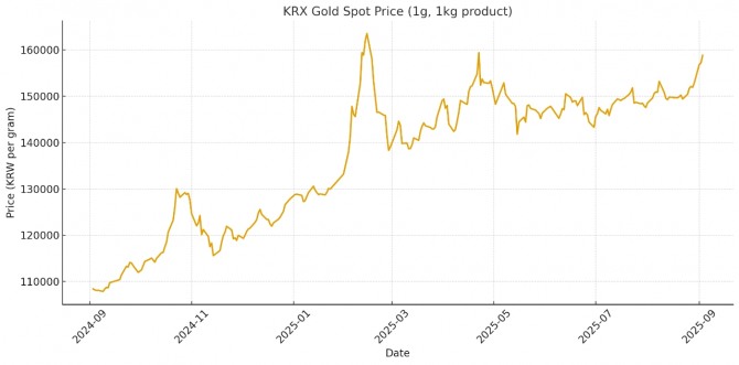이미지 확대보기3일 한국거래소에 따르면 이날 1㎏짜리 금 현물(99.99_1kg) 가격은 전 거래일보다 1.06% 오른 1g당 15만8840원에 거래를 마감했다. 장중 한때는 15만9910원까지 치솟기도 했다 .