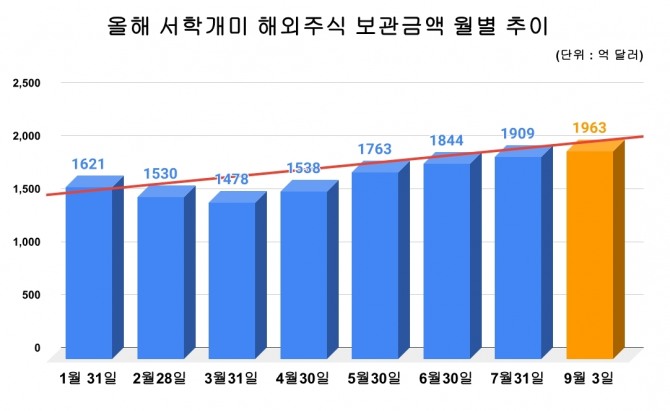 해외주식 보관액은 올해 들어 꾸준히 증가세를 이어왔다. 1월 말 1621억 달러에서 3월 말 1479억 달러로 잠시 주춤했으나, 이후 반등에 성공하며 4월 1538억 달러, 5월 1763억 달러, 6월 1844억 달러로 매달 최고치를 갈아치웠다. 7월 말에는 1909억 달러로 1900억 달러 선을 넘었고, 9월 초 현재 1963억 달러까지 치솟았다. 불과 8개월 만에 약 342억 달러(약 48조 원)가 불어나며 ‘사상 최대’ 행진을 이어간 셈이다.