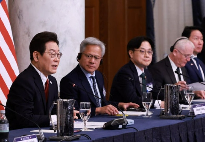 이미지 확대보기이재명 대통령이 지난 8월 미국 워싱턴DC 윌라드 호텔에서 열린 한미 비즈니스 라운드테이블에서 발언하고 있다. 왼쪽부터 이재명 대통령, 젠슨 황 엔비디아 대표, 김정관 산업통산자원부 장관. 사진=뉴시스