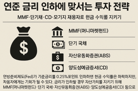 이미지 확대보기금리가 인하할 경우 자산가치를 지키기 위해 MMF(머니마켓펀드)·단기 국채·자산유동화증권(ABS)·양도성예금증서(CD) 등으로 포트폴리오를 재점검해야 한다고 전했다.