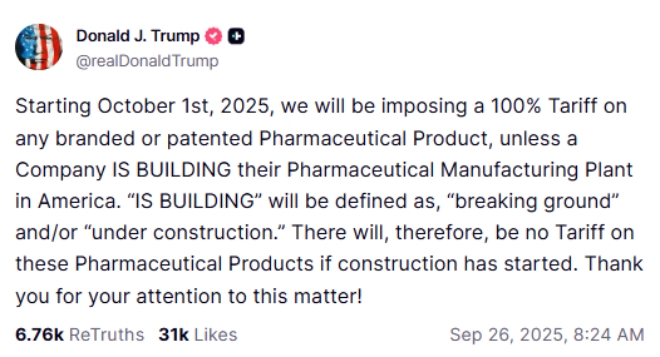 트럼프 대통령은 지난 25일 자신의 SNS 트루스소셜에 올린 글에서 “10월 1일부터 미국 내에서 제약 공장을 건설 중이지 않은 브랜드·특허 의약품에는 100% 관세를 부과한다”며 “공사가 착공됐거나 진행 중인 경우는 예외”라고 발표했다.