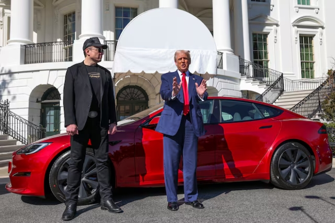 지난 3월 11일(현지시각) 도널드 트럼프 미국 대통령(오른쪽)이 워싱턴 DC 백악관에서 테슬라 차량을 배경으로 일론 머스크 테슬라 CEO와 함께 기자들과 대화하고 있다. 사진=로이터