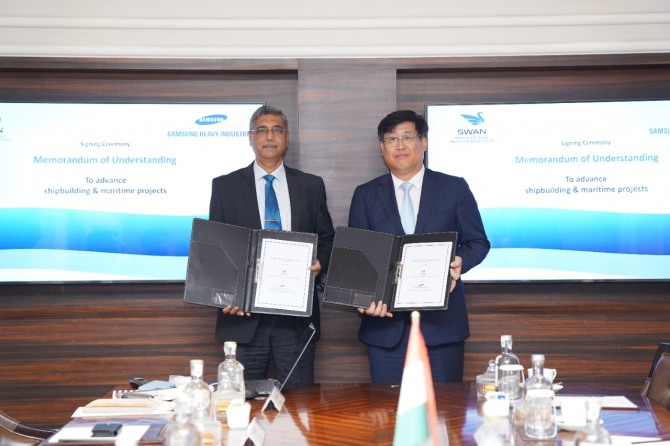 이미지 확대보기삼성중공업은 인도 북서부에 있는 스완 조선소와 '조선·해양사업 협력'을 위한 양해각서(MOU)를 체결했다고 29일 밝혔다.