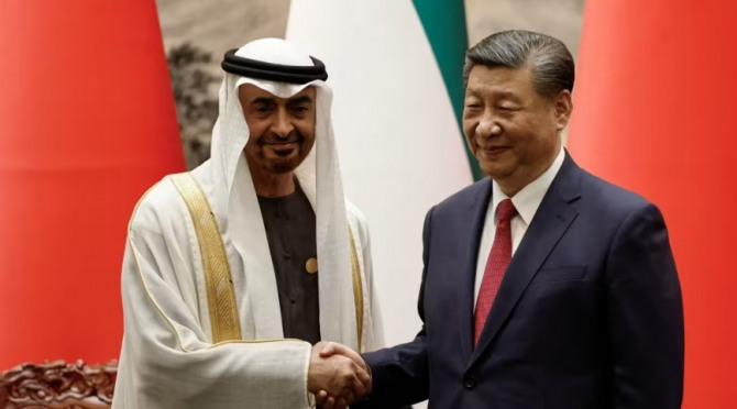 셰이크 모하메드 빈 자이드 알 나흐얀 아랍에미리트 대통령(왼쪽)과 시진핑 중국 국가주석이 2024년 베이징에서 악수를 하고 있다. 사진=로이터