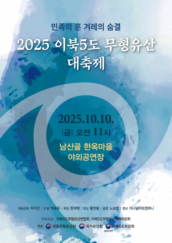 이미지 확대보기이북5도무형유산연합회가 주최·주관하고, 국립무형유산원, 국가유산청, 이북5도위원회가 후원하며 연합회 소속 20개 단체가 모두 참여해 북녘 전통 공연예술을 선보인다.