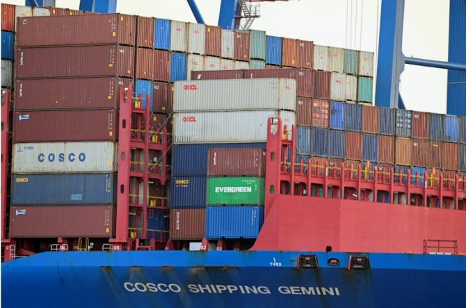 독일 함부르크 항구 컨테이너 터미널 톨레로르트에서 중국 해운사 코스코의 화물선 코스코해운 제미니가 선적되고 있다. 사진=로이터
