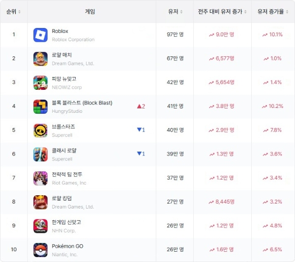특히 블록 블라스트는 WAU 톱10 게임 중 상승률이 가장 높은 게임으로이었다. 1위 '로블록스'가 10.1%로 근소한 차이를 보였으며 그 외에도 '브롤스타즈', '포켓몬 고' 등 저연령층에게 인기를 끄는 게임들이 높은 상승률을 보였다.