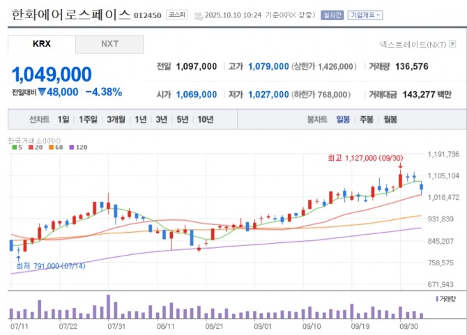 한화에어로스페이스 주가 추이. 사진=네이버페이 증권