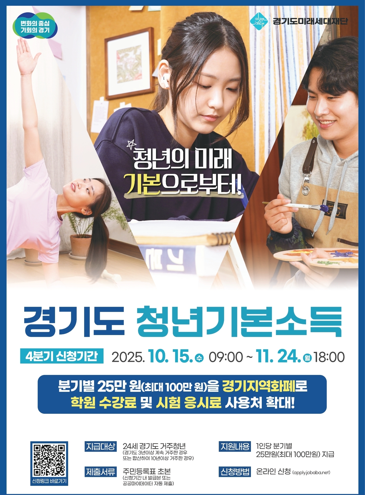 청년기본소득은 분기별 25만원씩, 최대 100만원까지 지급되며 소득이나 취업 여부와 관계없이 신청할 수 있다. 3분기 대상자였지만 신청하지 못한 청년도 24세가 유지되는 분기 내에 경기도에 주민등록이 되어있다면 이번에 신청해서 소급해 받을 수 있다.