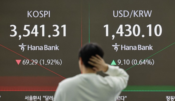 13일 오전 서울 중구 하나은행 딜링룸에서 딜러들이 업무를 보고 있다. 코스피가 전 거래일 대비 60.52포인트(1.68%) 내린 3550.08에 출발했다. 원달러 환율은 9.0원 오른 1430.0원으로, 코스닥지수는 13.73포인트(1.60%) 하락한 845.76에 거래를 시작했다. 사진=뉴시스이미지 확대보기