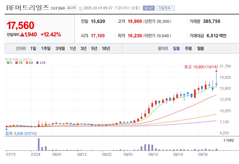 RF머트리얼즈 주가 추이. 자료=네이버페이 증권