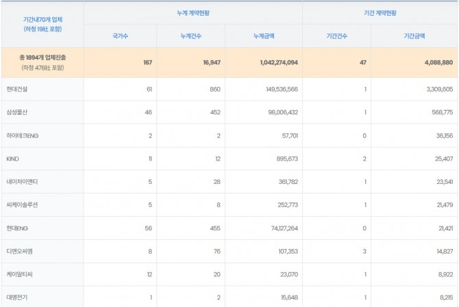 3~5위는 각각 하이테크엔지니어링(3615만달러), 한국해외인프라도시개발지원공사(2540만달러), 네이처이앤티(2354만달러)다.