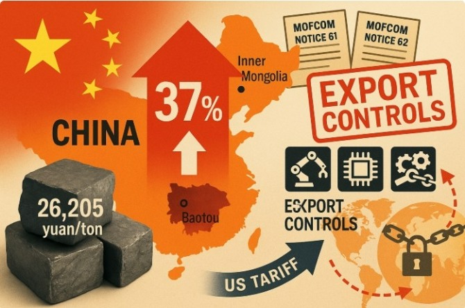 이미지 확대보기14일(현지시각) IT 전문 매체 디지타임스에 따르면 중국북방희토그룹과 내몽고포두철강연합이 4분기 희토류 정광 거래 가격을 세전 톤당 2만6205위안(약 524만6765원)으로 올렸다. 인상 폭은 37%다. 다섯 분기 연속 인상으로 2023년 말과 견주면 누적 상승률이 56%를 넘는다. 게다가 중국 정부가 인공지능(AI)과 반도체까지 포함한 새 수출 제한을 알린 뒤 하루 만에 가격 조치가 뒤따랐다.