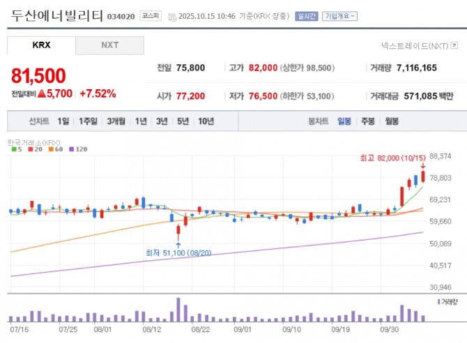 이미지 확대보기15일 한국거래소에 따르면 이날 오전 10시 46분 현재 두산에너빌리티는 전 거래일 대비 7.52% 오른 8만 1500원에 거래되고 있다. 주가는 장중 8만 2000원까지 올라 52주 신고가를 기록했다.