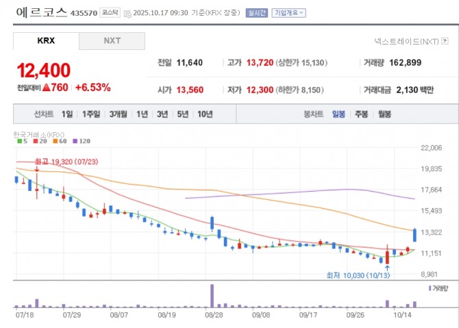 이미지 확대보기17일 한국거래소에 따르면 이날 오전 9시 30분 현재 에르코스는 전 거래일 대비 6.53% 오른 1만2400원에 거래 중이다. 뉴키즈온(3.86%), 메디앙스(1.00%), 제로투세븐(0.11%) 등도 오르고 있다.