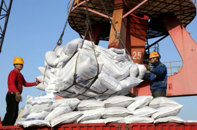 근로자들이 중국 동부의 한 항구에서 염화칼륨 포대를 트럭에 싣고 있다. 사진=로이터