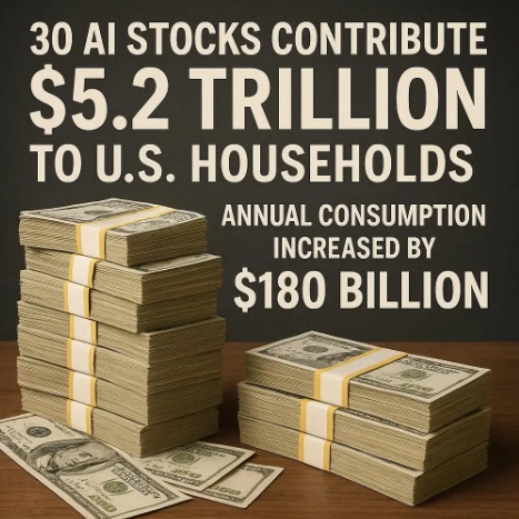 이미지 확대보기미국 인공지능(AI) 관련 주식 30개가 지난 1년간 미국 가계에 5조 2000억 달러(약 7400조 원)의 부를 안겨줬고, 이 때문에 연간 1800억 달러(약 256조 원)의 소비 지출이 늘어난 것으로 나타났다고 지난 18일(현지시각) 악시오스가 JP모건 경제학자들이 발표한 분석을 인용해 보도했다.