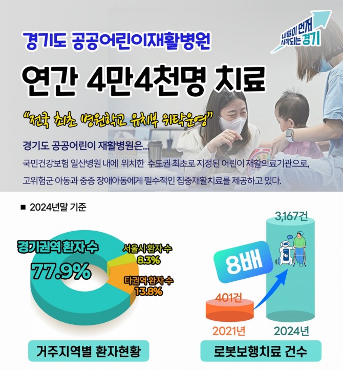 국민건강보험 일산병원 내에 위치한 경기도 공공어린이재활병원은 수도권 최초로 지정된 어린이 재활의료기관으로, 고위험군 및 중증 장애아동을 대상으로 필수적인 집중재활치료를 시행하고 있다. 또한 아동과 가족이 거주지 인근에서 단절 없이 치료받을 수 있도록 지역사회 기반의 재활의료체계를 구축했다.