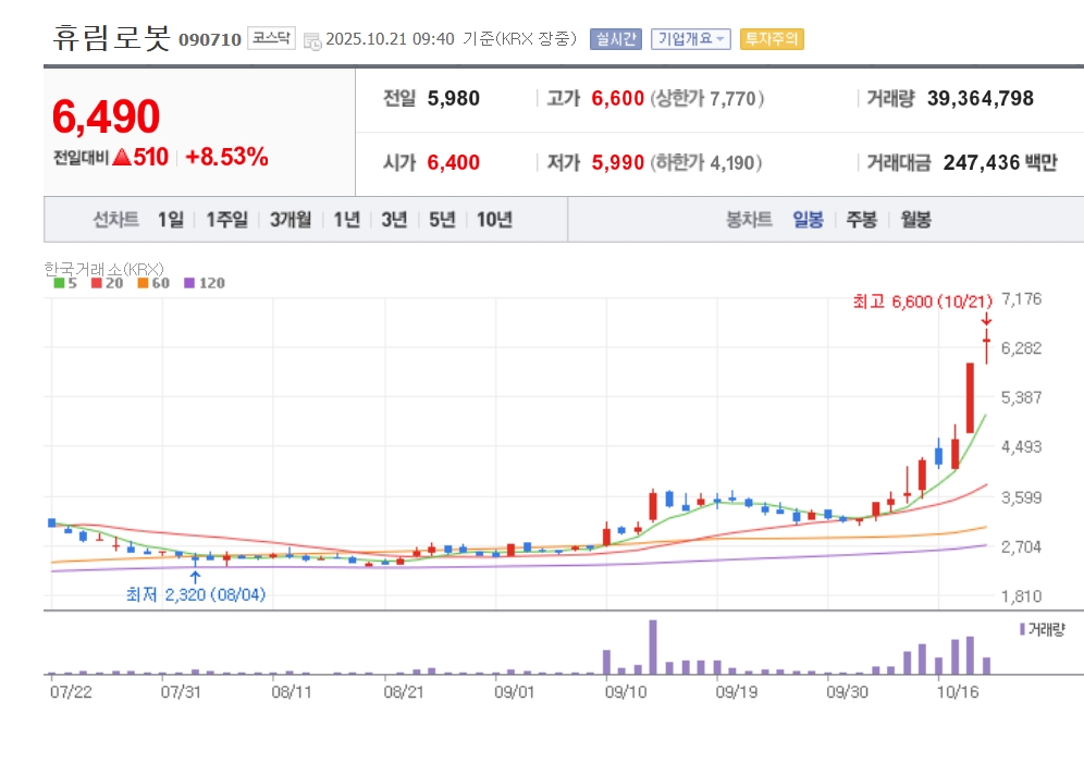 21일 한국거래소에 따르면 휴림로봇은 오전 09시40분 전 거래일 대비 8.53% 오른 6490원에 거래중이다. 전날에는 전장 대비 29.86% 오른 5980원에 장을 마쳤다. 이날 하루 거래량이 8000만 주를 돌파했으며, 가격제한폭까지 치솟으며 52주 신고가를 경신한 바 있다.