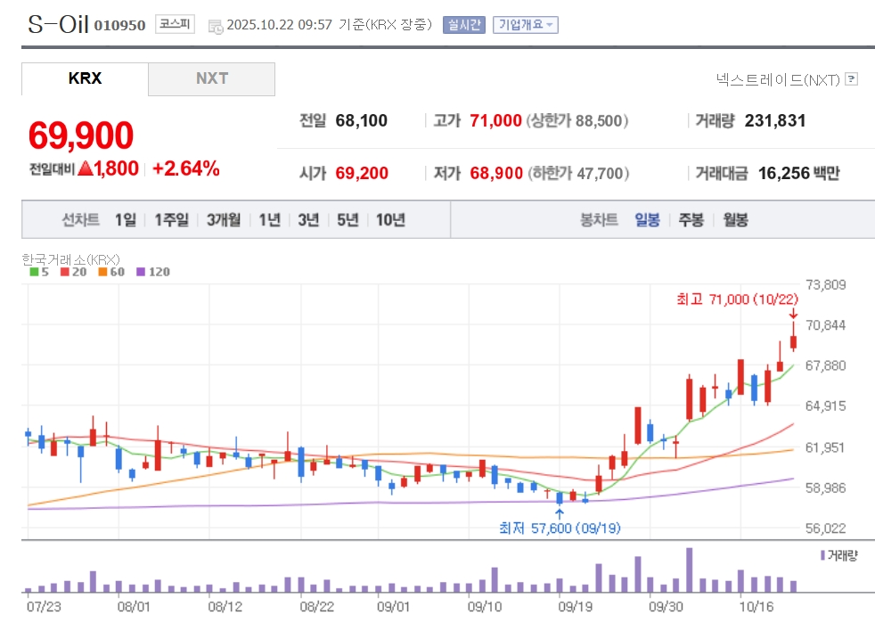 22일 한국거래소에 따르면 오전 9시 57분 S-Oil은 전날 대비 2.64% 오른 6만9900원에 거래되고 있다. 지난 20일부터 3일 연속 상승세를 이어가고 있다. 장중 7만1000원을 터치하며 52주 신고가를 기록했다.