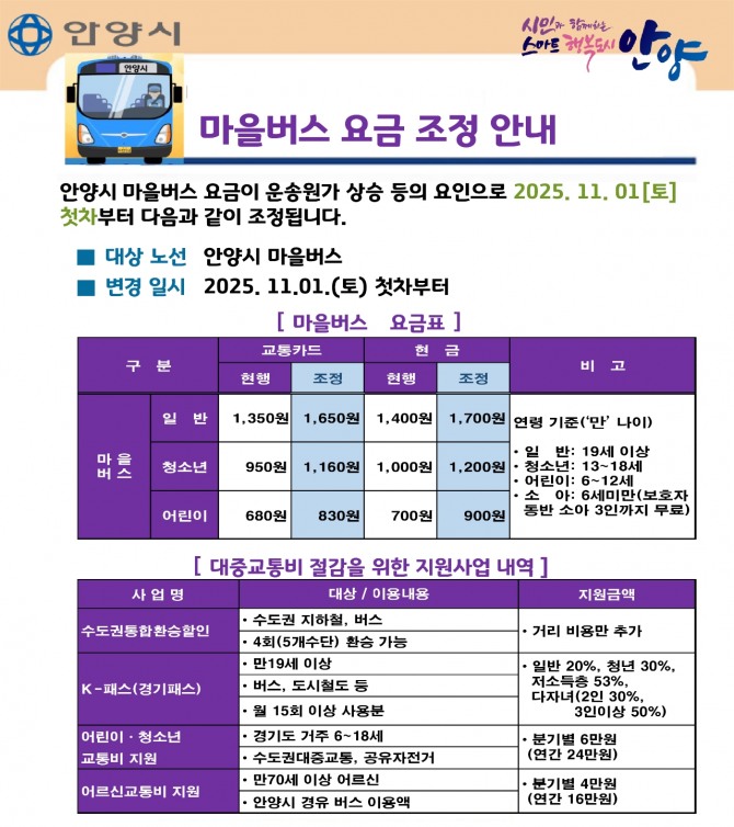 이미지 확대보기교통카드 기준으로 일반은 1,350원에서 1,650원으로 300원, 청소년은 950원에서 1,160원으로 210원, 어린이는 680원에서 830원으로 150원 오른다. 이번 조정은 안양시 관할 전 노선에 일괄 적용된다.