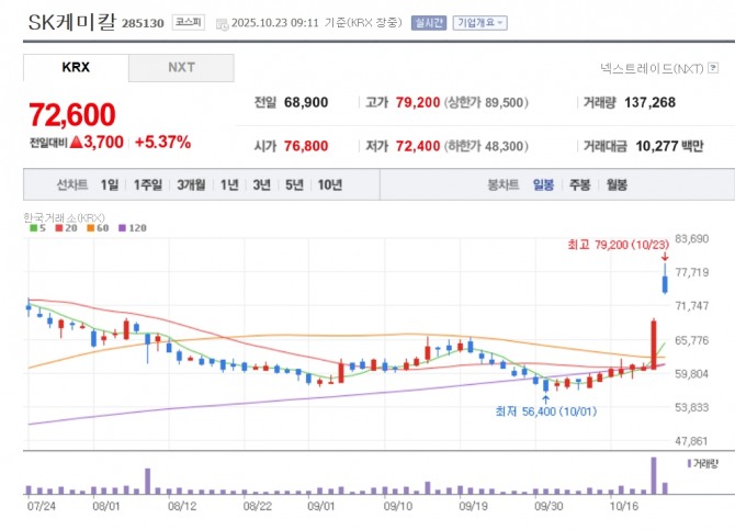 이미지 확대보기23일 한국거래소에 따르면 오전 9시 11분 기준 SK케미칼은 전일 대비 5.37% 상승한 7만2600원에 거래되고 있다. 장 중 7만9200원까지 오르며 52주 신고가를 기록했다. 우선주인 SK케미칼우 역시 20% 치솟았다.