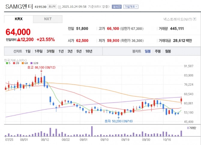 이미지 확대보기24일 한국거래소에 따르면 이날 오전 9시 58분 현재 SAMG엔터는 전 거래일 대비 23.55% 오른 6만4000원에 거래 중이다.