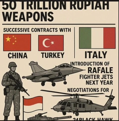 템포 보도를 보면 인도네시아는 취임 첫해에 최소 4가지 주요 무기를 들여오기로 했다. 중국 J-10 전투기는 6조4900억 루피아(약 5590억 원), 튀르키예 KAAN 전투기는 19조8600억 루피아(약 1조7100억 원), 튀르키예 I급 호위함은 18조2100억 루피아(약 1조5600억 원), 이탈리아제 가리발디 항공모함은 7조4500억 루피아(약 6400억 원) 규모다.