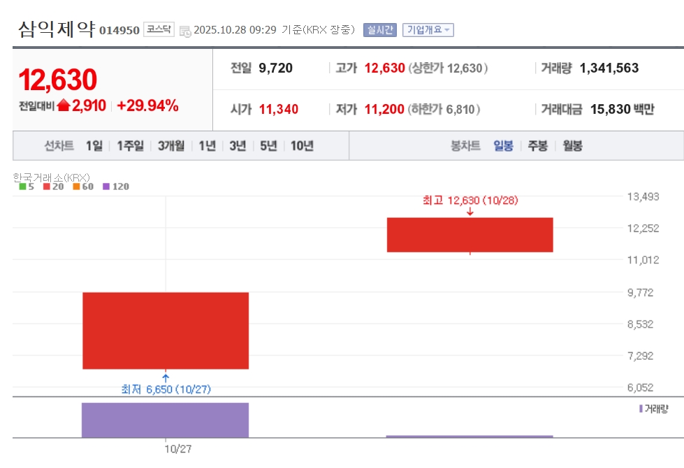 이미지 확대보기28일 한국거래소에 따르면 이날 오전 9시29분 현재 삼익제약은 전날에 비해 29.94% 오른 1만 2630원에 거래 중이다. 삼익제약은 27일 하나금융제28호스팩을 흡수합병을 통해 코스닥에 상장했다. 상장 첫날 종가는 기준가 7480원 대비 상한가까지 상승한 9720원을 기록했다.