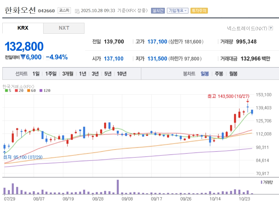 이미지 확대보기28일 한국거래소에 따르면 한화오션 주식은 오전 9시 33분 코스피시장에서 전일대비 4.94% 내린 13만2800원에 거래 중이다.