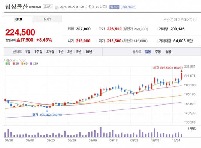 이미지 확대보기29일 한국거래소에 따르면 오전 9시 28분 현재 삼성물산은 전 거래일보다 8.45% 오른 22만 4500원에 거래되고 있다. 장중 22만 6500원까지 치솟아 52주 신고가를 경신했다.