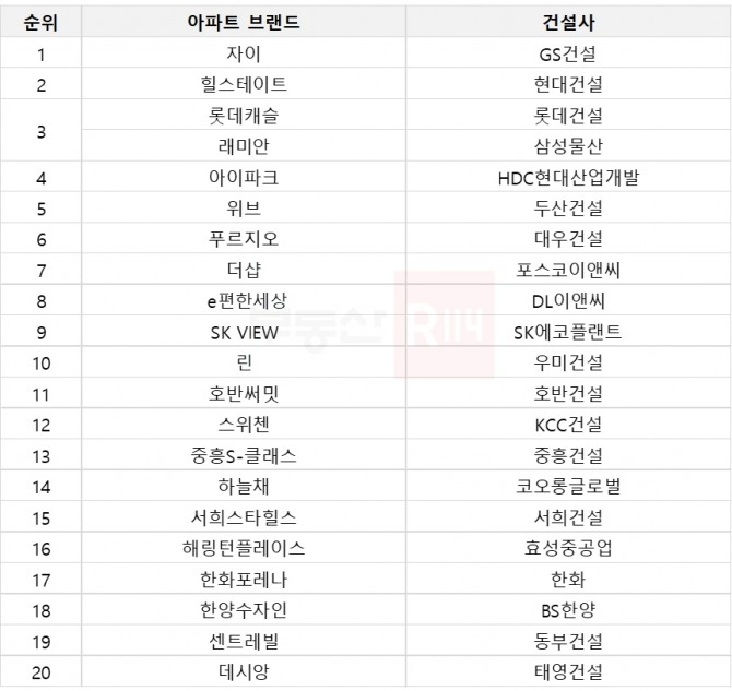 올해 조사에서는 GS건설 자이가 브랜드 상기도, 인지도, 투자가치 등에서 높은 평가를 받으며 선두를 차지했다.
