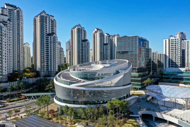 대보건설은 경기도 수원시 영통구 이의동 광교신도시 경기융합타운에 연면적 2만7775㎡(약 8400평), 지하 4층~지상 5층 규모의 경기도서관이 지난 25일 개관했다고 30일 밝혔다. 경기도서관. 사진=대보건설