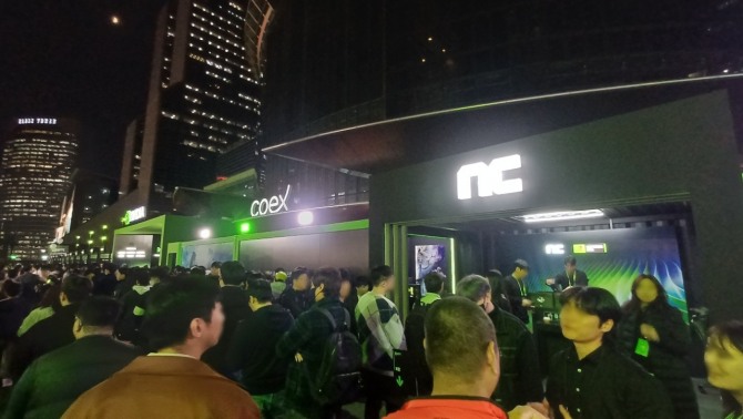 오후 7시에는 걸그룹 르세라핌의 공연 등이 예고된 게이머 페스티벌의 무대 공연이 열렸음에도 100여 명의 게이머들은 아이온2 시연을 위해 줄지어 기다리는 모습을 보였다.