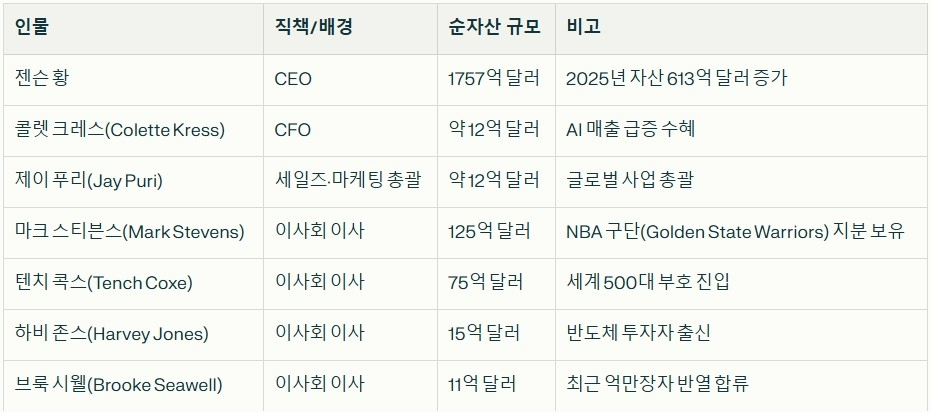 엔비디아의 콜레트 크레스(Colette Kress) CFO와 글로벌 현장 운영 담당 부사장인 제이 푸리(Jay Puri)는 각각 약 12억 달러의 순자산을 기록하며 10억 달러가 넘는 부호 대열에 합류했다.
