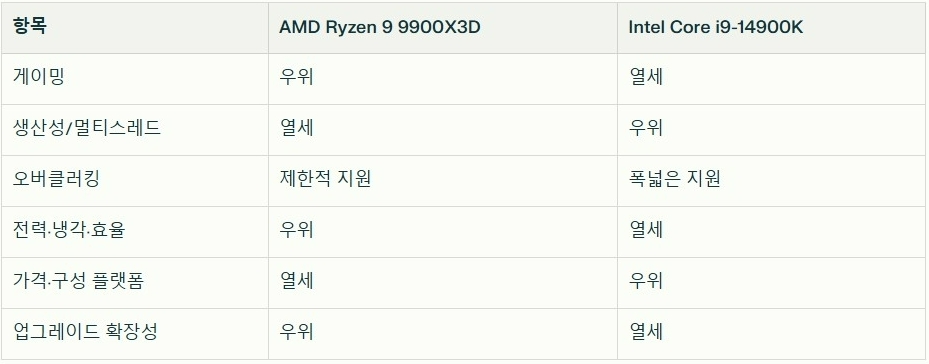 반면, 인텔의 14900K는 다중 작업 처리 능력과 오버클러킹 잠재력을 앞세웠으며, 더 낮은 초기 구매 비용으로 예산 확보의 여지를 제공한다. 다중 생산성·멀티스레드 작업, 오버클럭, 합리적 가격 선호라면 코어 i9-14900K가 우수하다.