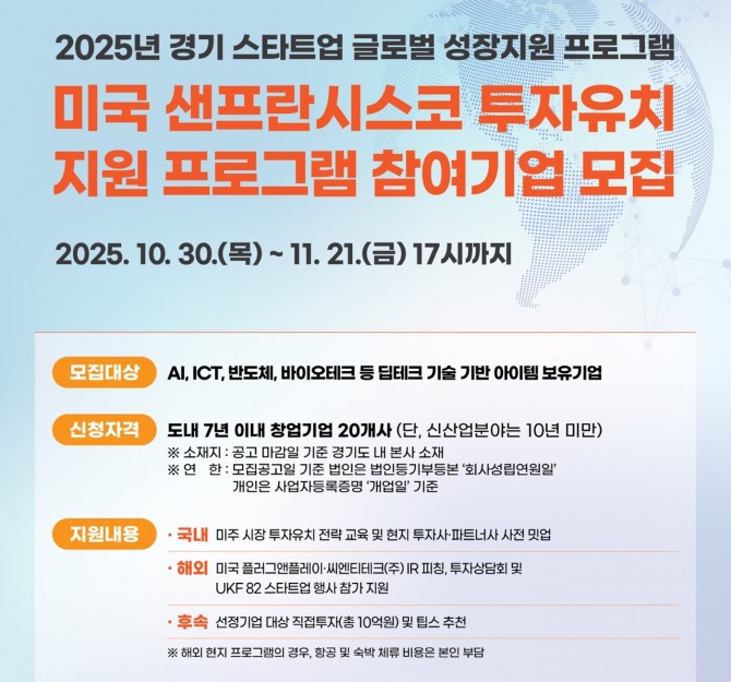 박양덕 경기도 벤처스타트업과장은 “실리콘밸리는 전 세계 혁신가와 투자자가 모이는 중심지로, 이번 프로그램은 도내 스타트업이 글로벌 시장에서 도약할 수 있는 기회의 장이 될 것”이라며 "앞으로도 잠재력 있는 기업이 세계 시장으로 나아갈 수 있도록 다양한 글로벌 연계 프로그램을 지속 추진하겠다”고 밝혔다.