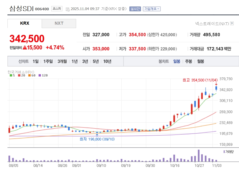 이미지 확대보기4일 엠피닥터에 따르면 이날 오전 9시37분 현재 삼성SDI는 전거래일 대비 4.74% 오른 34만 2500원에 거래 중이다. 장중 35만 4500원까지 오르면서 신고가를 기록했다.