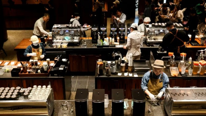 바리스타들이 브랜드의 전 세계 최대 매장인 상하이의 스타벅스 리저브 로스터리에서 음료를 만들고 있다. 사진=로이터