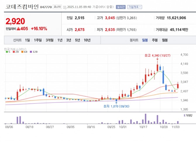 5일 한국거래소에 따르면 이날 오전 9시 40분 현재 코데즈컴바인은 전 거래일 대비 16.10% 급등한 2920원에 거래되고 있다. 이외 남북경협주로 묶이는 좋은사람들(9.79%), 양지사(7.44%), 제이에스티나(5.58%), 아난티(4.25%), 인디에프(4.16%) 등이 큰 폭으로 오르고 있다.