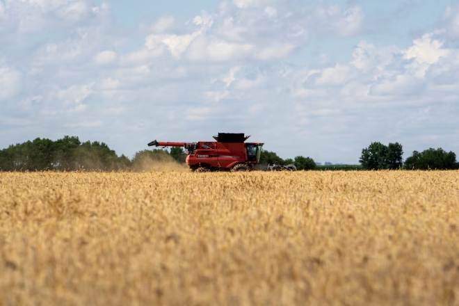지난 6월 12일((현지시각) 미국 오클라호마주 크렘린에서 콤바인이 밀이삭을 베어내고 있다. 사진=로이터이미지 확대보기
