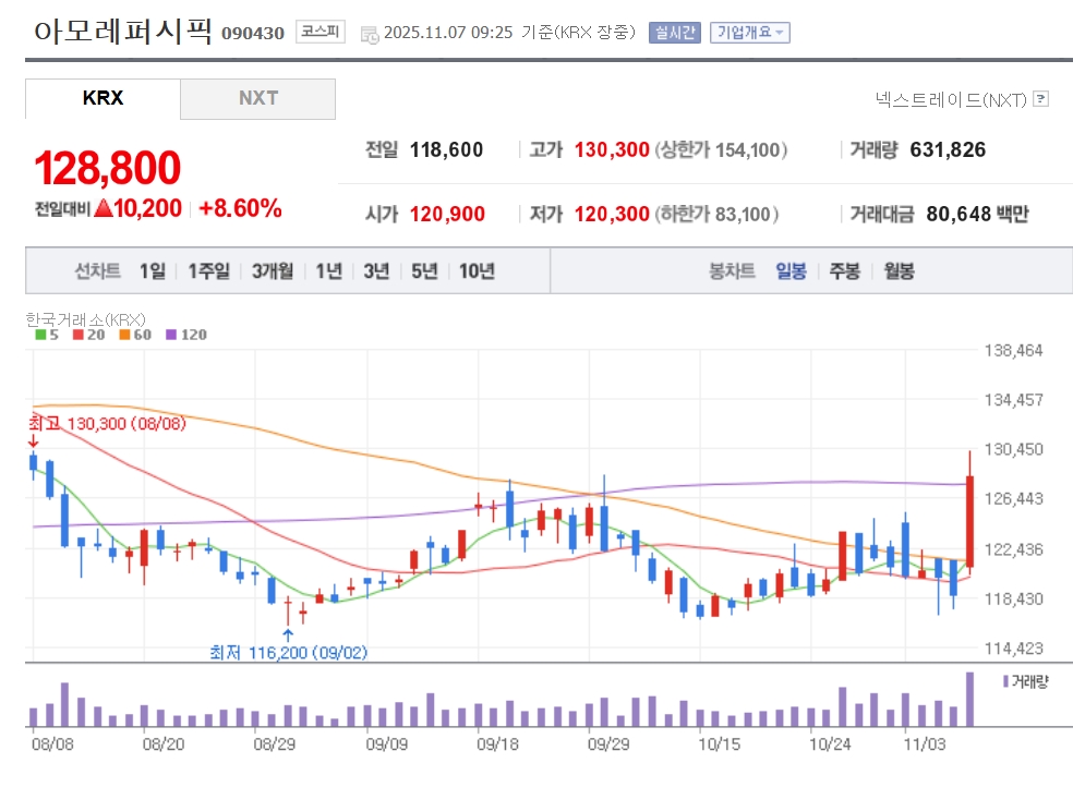 이미지 확대보기7일 한국거래소에 따르면 오전 09시25분 기준 아모레퍼시픽은 전일 대비 8.06% 오른 12만8800원을 기록하고 있다.