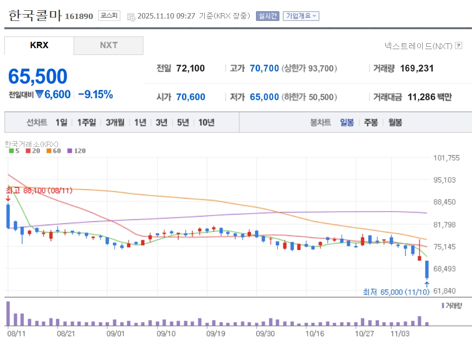 이미지 확대보기10일 한국거래소에 따르면, 한국콜마는 이날 오전 9시 27분 기준으로 전 거래일 대비 9.15% 떨어진 6만 5500원에 거래되고 있다.