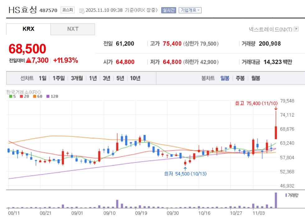 이미지 확대보기10일 한국거래소에 따르면 이날 오전 9시 38분 기준 효성그룹의 지주사인 HS효성은 전 거래일 대비 11.93% 오른 6만 8500원에 거래되고 있다. 지주사인 코오롱(12.59%), 한화(8.17%), SK(7.68%), 하나금융지주(6.52%), 하림지주(6.33%) 등도 강세다.