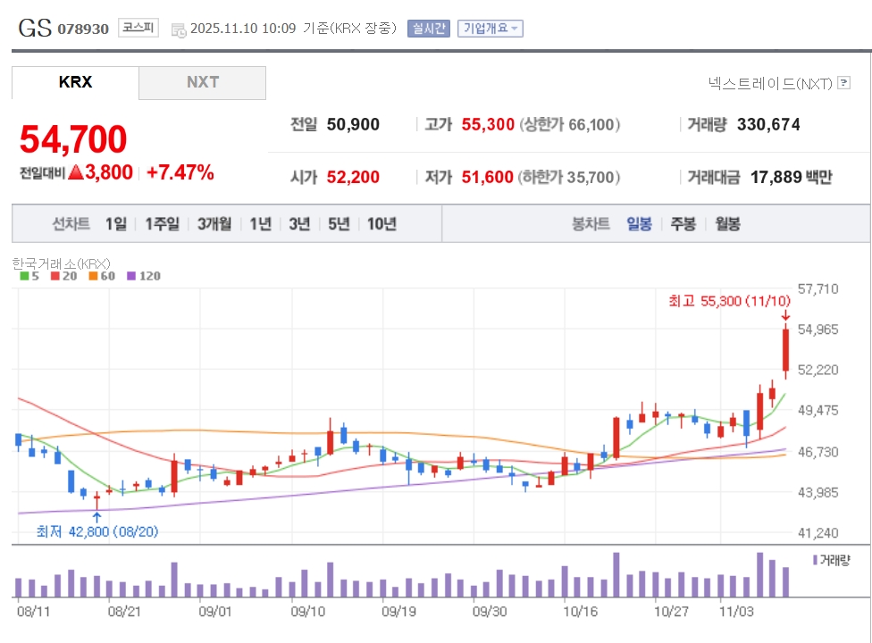 이미지 확대보기10일 한국거래소에 따르면 오전 10시 09분 기준 GS 주가는 전 거래일 대비 7.47% 오른 5만4700원에, S-Oil 주가는 전 거래일 보다 6.72% 상승한 7만9400원에 거래되고 있다.