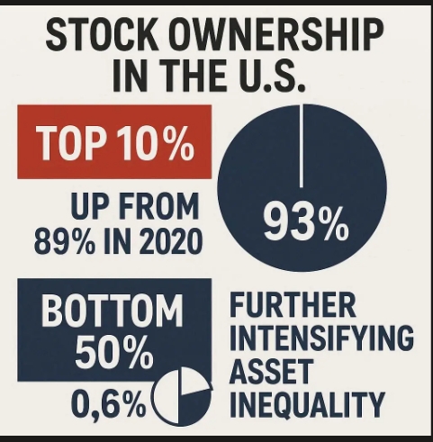 한편 연준의 최신 자료(2024년 3분기)에 따르면 상위 10% 부유층이 전체 주식의 93%를 보유하고 있으며, 이는 2020년 89%에서 4%포인트 증가한 수치다. 하위 50% 계층의 주식 보유 비중은 0.6%에 불과해 자산 불평등이 더욱 심화된 것으로 나타났다.