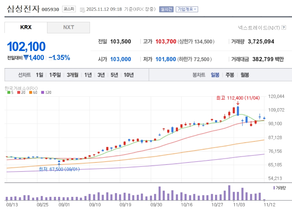 이미지 확대보기12일 한국거래소에 따르면 이날 오전 9시 18분 현재 삼성전자는 전 거래일 대비 1.35% 내린 10만 2100원에 거래되고 있다. SK하이닉스는 2.10% 내린 60만 6000원에 거래 중이다.