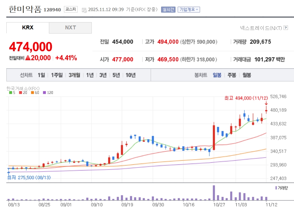 12일 한국거래소에 따르면 오전 9시 16분 현재 한미약품은 전 거래일보다 4.41% 오른 47만 4000원에 거래되고 있다. 장중 49만 4000원까지 치솟아 52주 신고가를 경신했다.